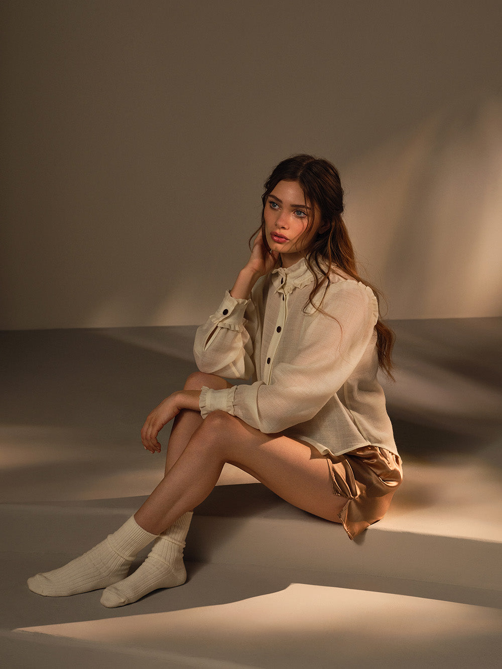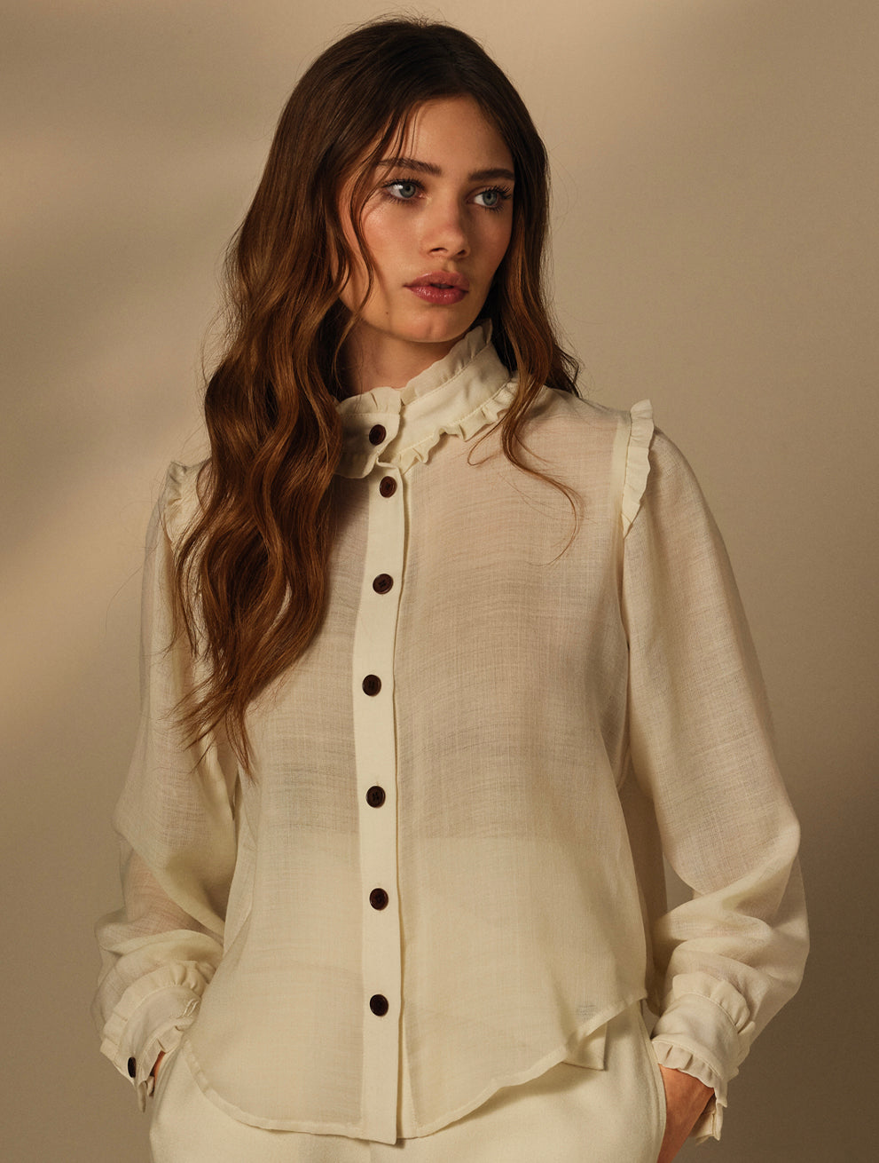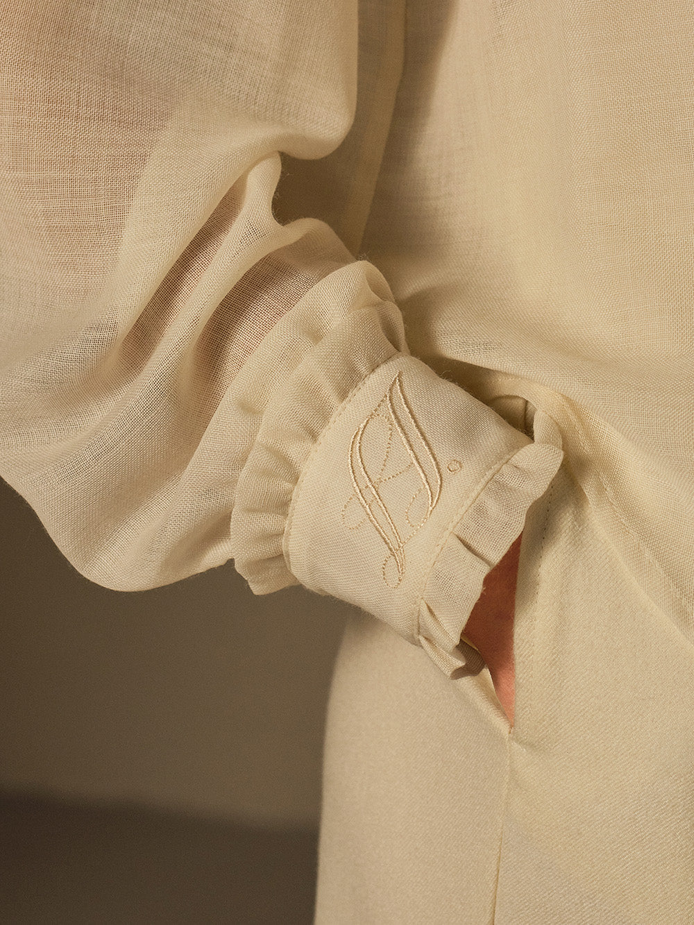 Just as our homes shape emotion, garments too can invite a sense of stillness and space. Crafted in the UK from natural, undyed wool-gauze, the semi-sheer Isabella Blouse features delicate ruffles and a refined embroidered cuff. Lightweight and fluid, its airy structure frames the body with quiet elegance, easing the transition from meditation to movement with effortless grace.