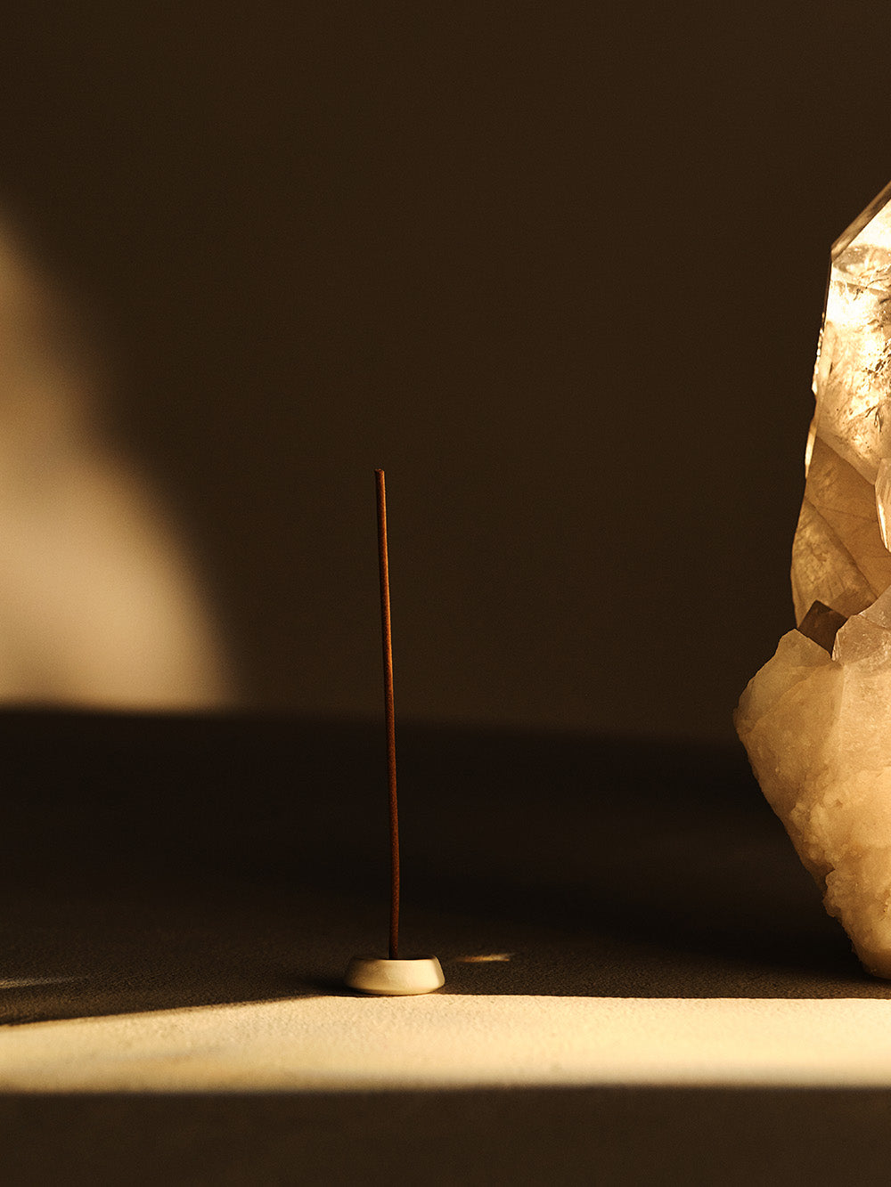 Known as scent-scaping, fragrance is a vital element of emotional architecture, shaping atmospheres through the conscious integration of scent. Connecting to the limbic system – where memories and emotions reside – it elicits deep sensory responses. Crafted with such intention, our Mwema Incense blends acacia wood, frankincense, and sandalwood to bring balance and harmony. Each set includes a handcrafted ceramic holder, designed with rhythmic form and tactile beauty.